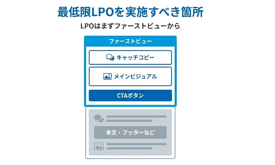最低限改善するLPOは、ファーストビュー、コンテンツ、CTAボタンになります。