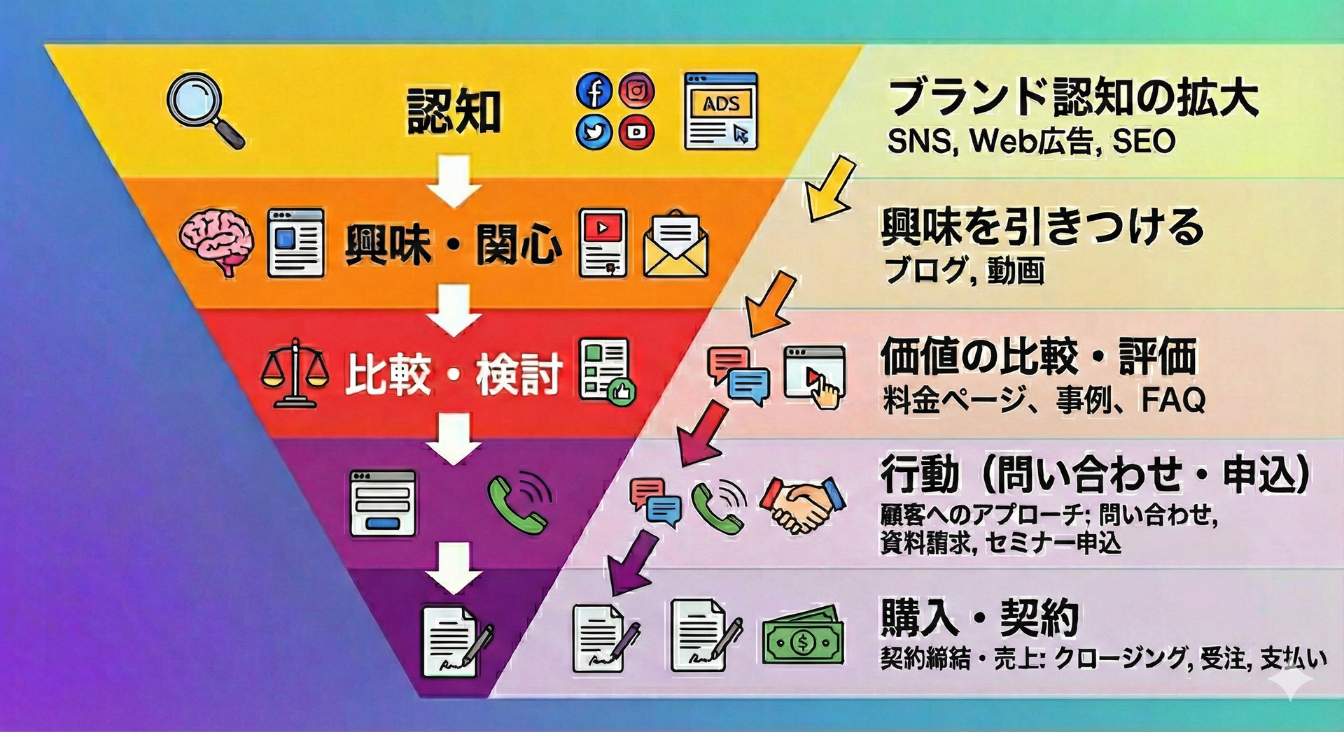 認知 ⇒ 興味 ⇒ 比較 ⇒ 購入 といった流れを、上から下にすぼまる構造で表します。