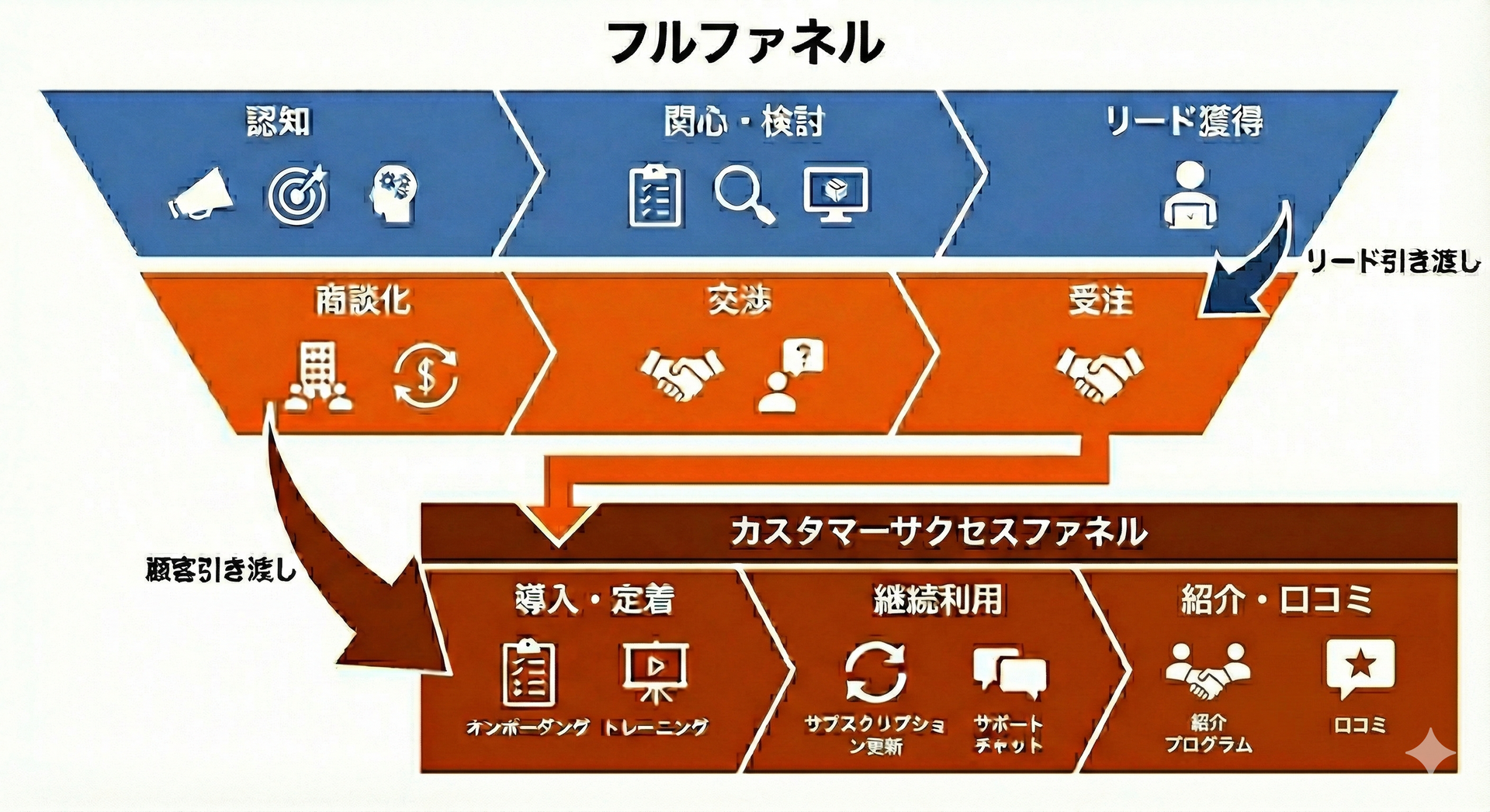 上記のマーケ側と営業側の流れをつなげて一枚の図にしたものが以下になります。
