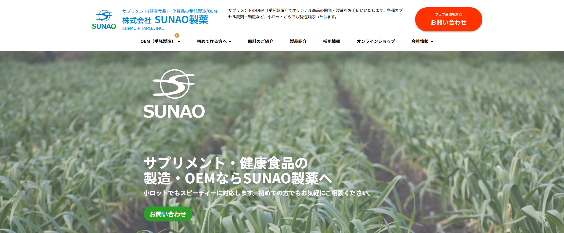 | SUNAO製薬 | サプリ全形状とドリンク・ゼリー・健康茶まで対応。目安ロットを明確提示し少量から相談可。 | 最小ロットが具体的で計画が立てやすい。リードタイム目安も公開。 | 健康食品 | 錠剤、カプセル、顆粒、ドリンク等 | 打錠30kg/カプセル5万粒/顆粒60kg/ドリンク2,000本/ゼリー3万包/茶1,000包 |
