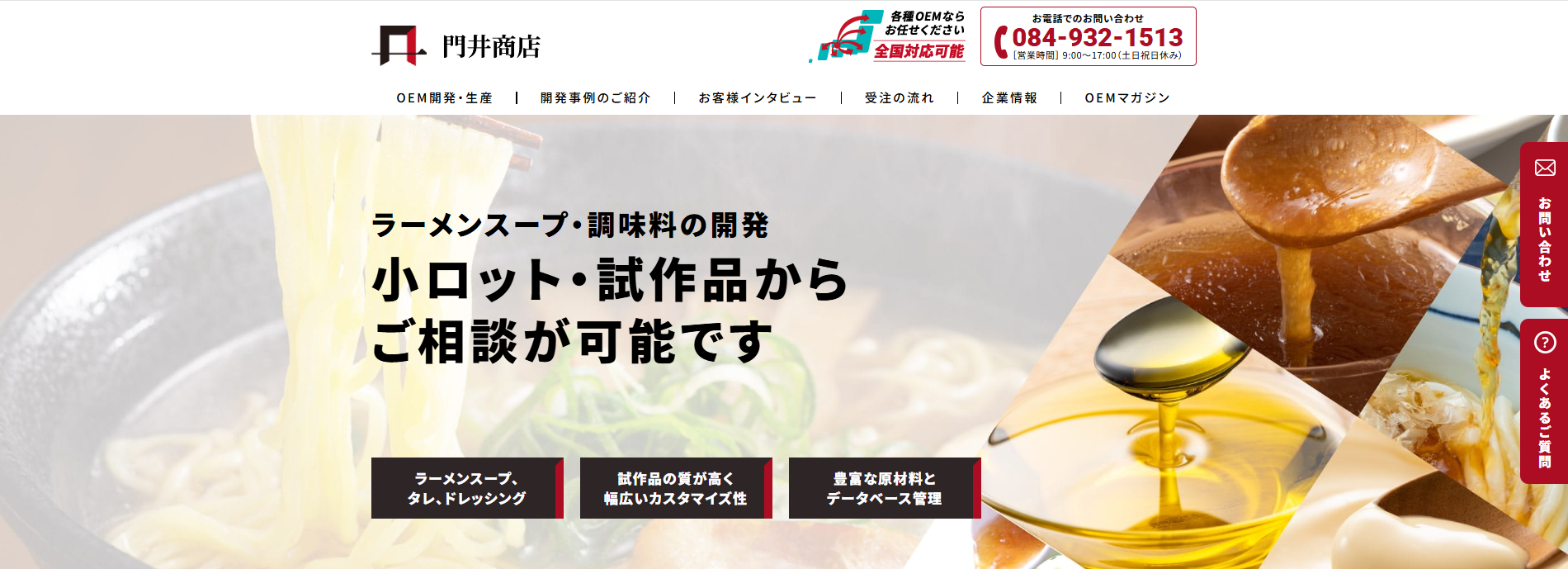 | 門井商店 | タレ・ソース等の液体調味を企画〜製造。味の微調整と試作が速く、PBや外食の瓶・袋充填に対応。 | 目安100kg〜の小ロット。粘度や具材量に応じた“売れる味”のチューニングが得意。 | 食品(液体調味) | たれ・ソース、ラーメンスープ、ドレッシング | 約100kg〜(目安) |